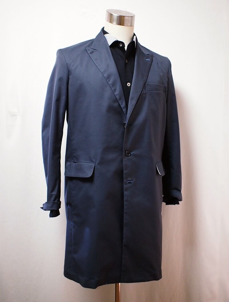 身頃脇と袖下、袖付けの縫い代は端ロックして片倒しコバステッチ、三つ折りステッチした裾はラウンドカット、着丈はパンツインし易い76㎝