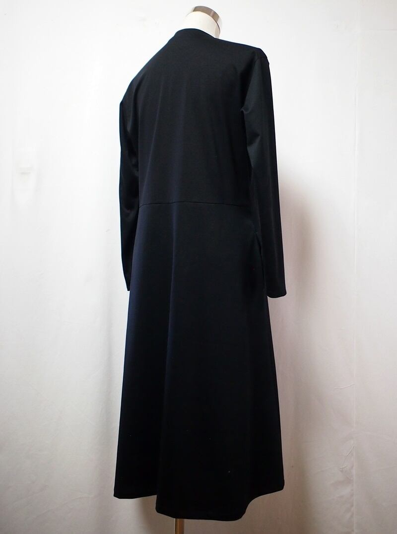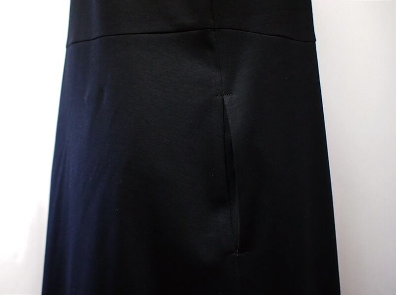 真っ黒なクルーネックのプルオーバーワンピース、両腰脇にはシーム(接ぎ目)を利用したシームポケット