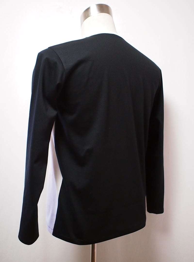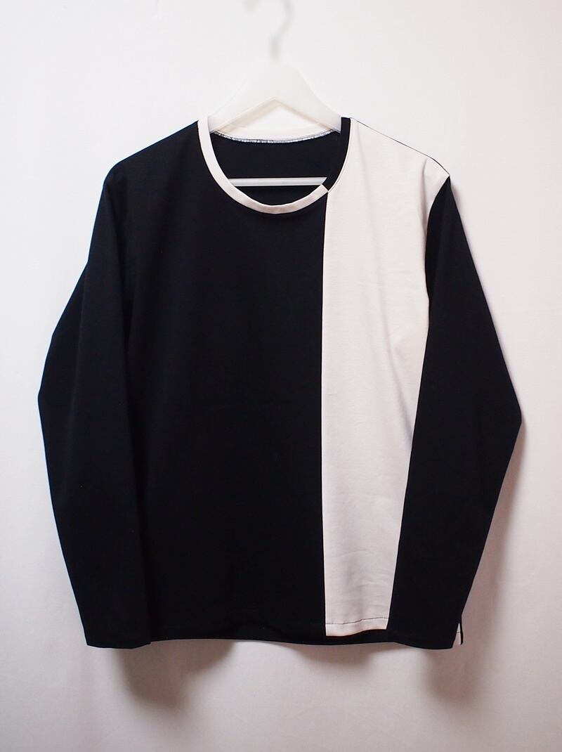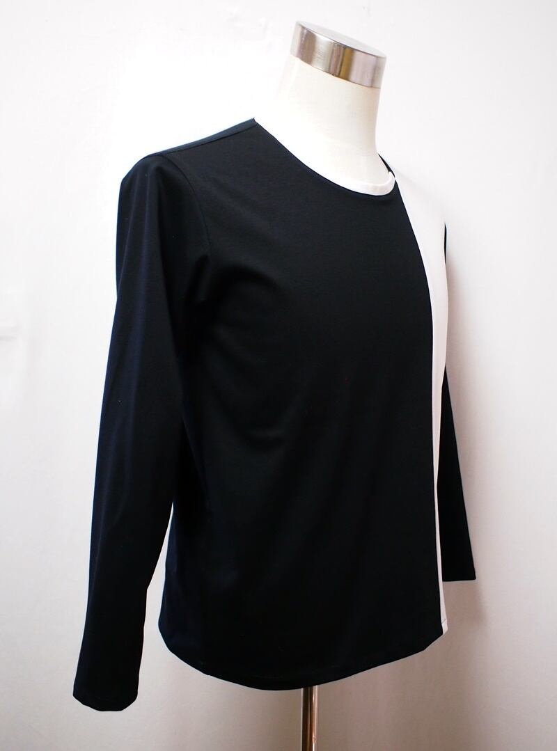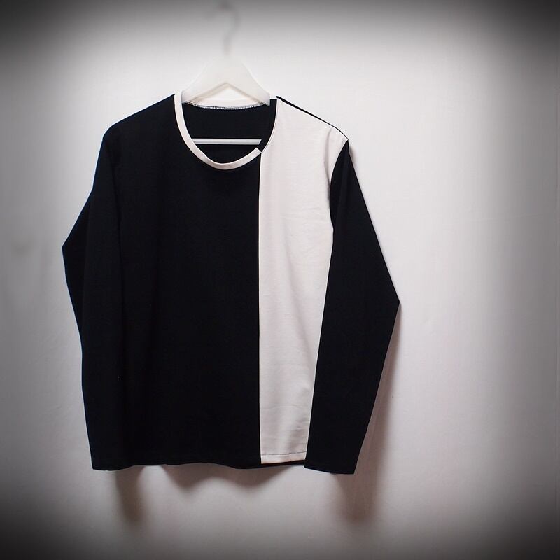 真っ黒とオフホワイトのバイカラーでアシンメトリーに配色したクルーネックのロングスリーブT