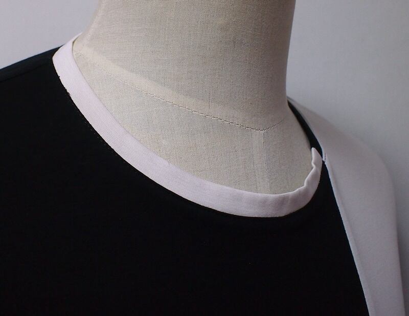 衿ぐりは1.2㎝幅の共布テープを接ぎ、裏側ロックして押さえステッチ、「ロック付け衿」と言う、クルーネックのカットソーでは一番多い衿ぐり仕様