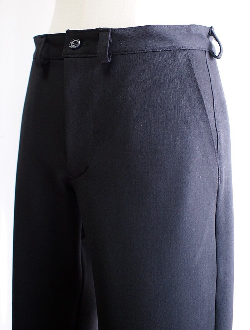 前側ノータックで両脇にスラントポケットのシンプルなデザイン、後の腰にフィットするダーツ1本、ボタン留めの片玉縁ポケット