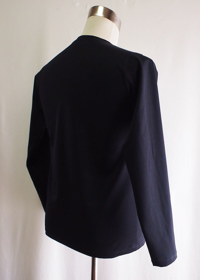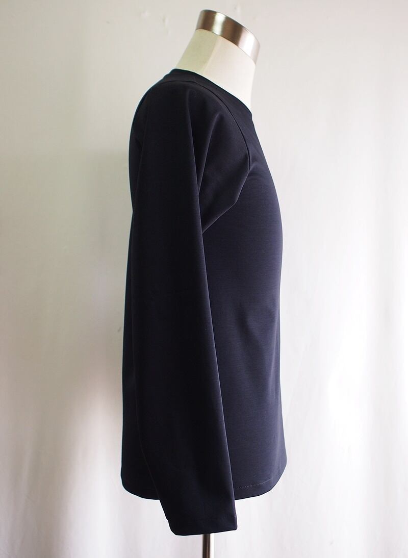 肩、袖ぐり、袖下から両脇など全てのシーム(接ぎ目)は地縫いして端ロック片倒し、袖口と裾は端ロックして二つ折りステッチ仕様
