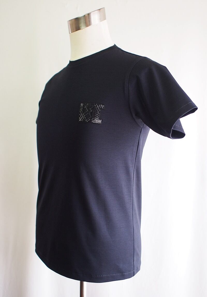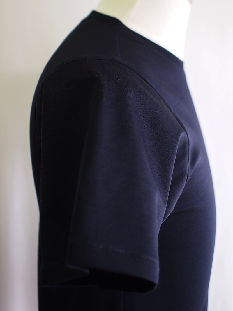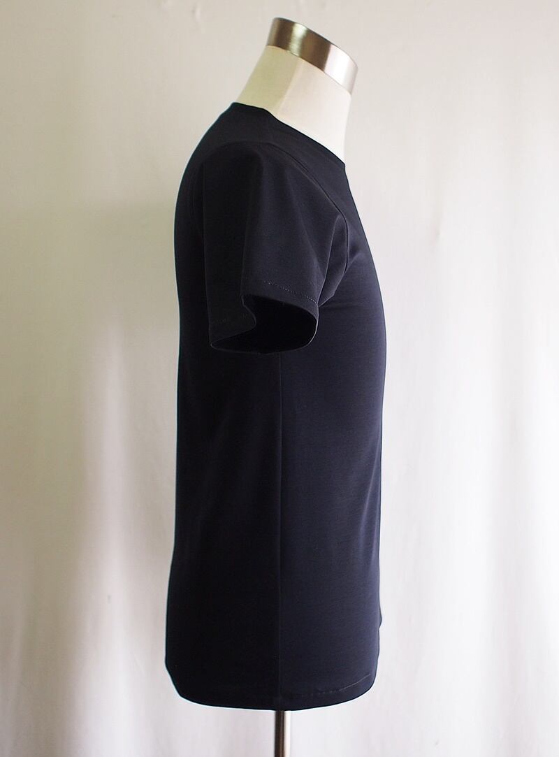 少し以前にご紹介したロンT「60/-スーピマコットン 32Gポンチ WIロゴアップリケ クルーネック ロンT ダークネイビー」こちらと同じ素材と色合いのショートスリーブTシャツです。