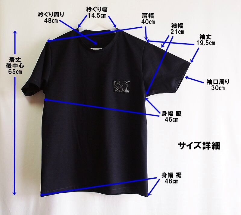 肩幅40㎝、袖丈19.5㎝のショートスリーブ、着丈65cm、身幅は脇で46㎝、裾48㎝、Sくらいのサイズ感