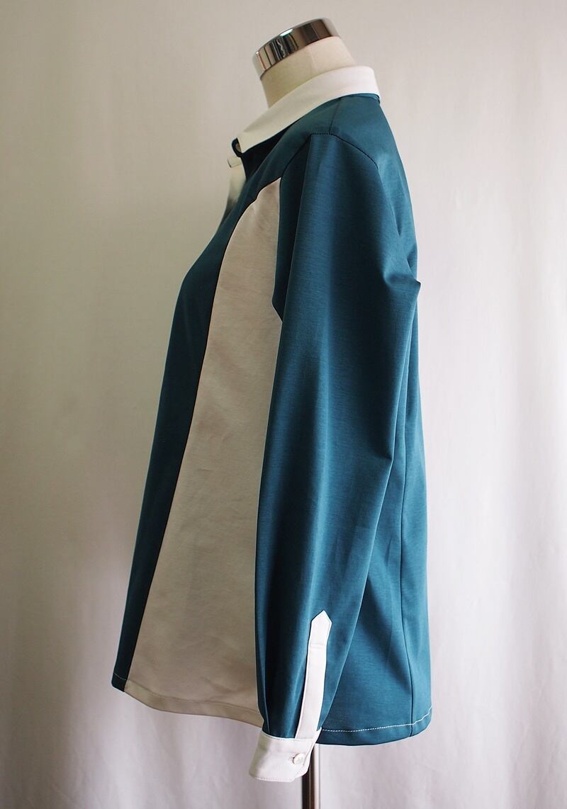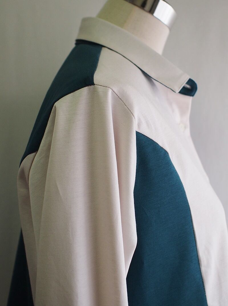 左右の袖と袖口も互い違いに配色、やや細めの袖幅でスッキリ見える袖口ワンタック、ボタン無しの剣ボロで袖口は3.7㎝幅カッタウェイカフス