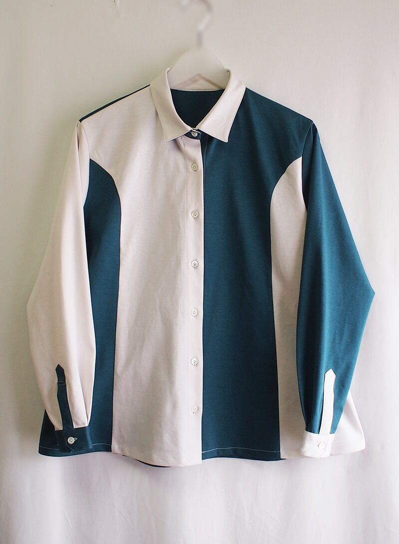 アイボリーとグリーンのバイカラー使いでクレイジーパターンのオーバーブラウス