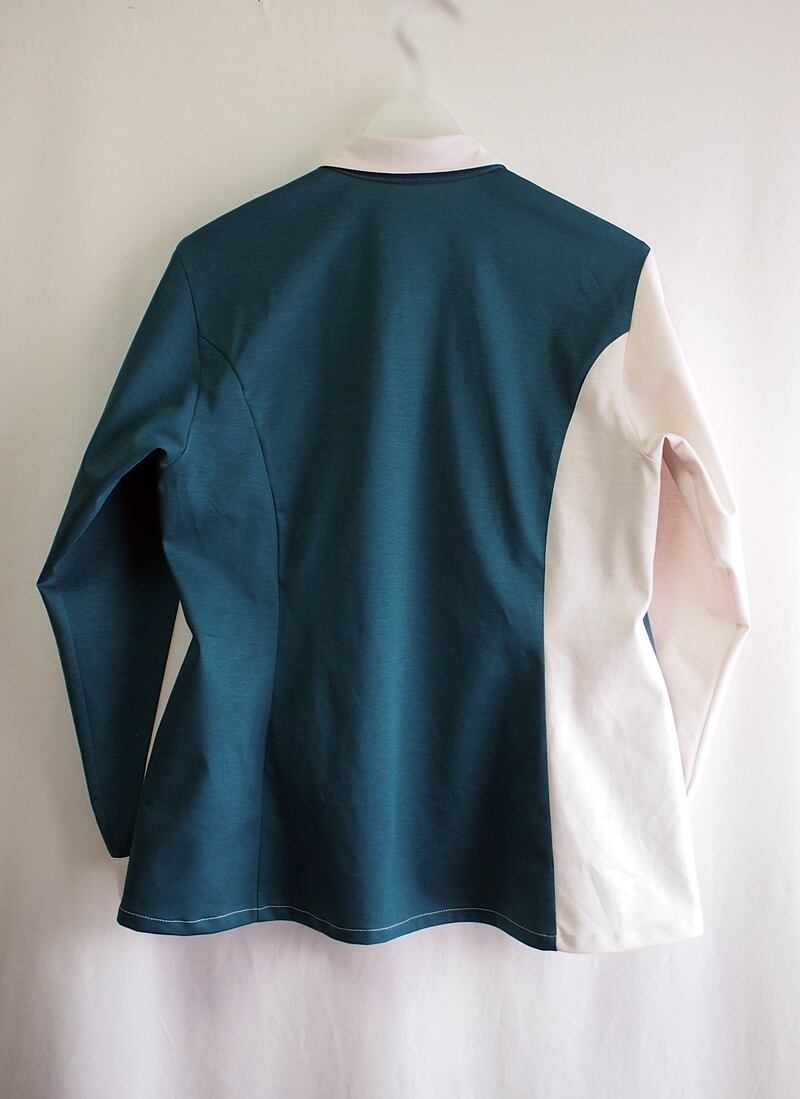 袖付けとパネルライン、脇の縫い代は端ロックして片倒し、裾はストレートカットで三つ折りステッチ