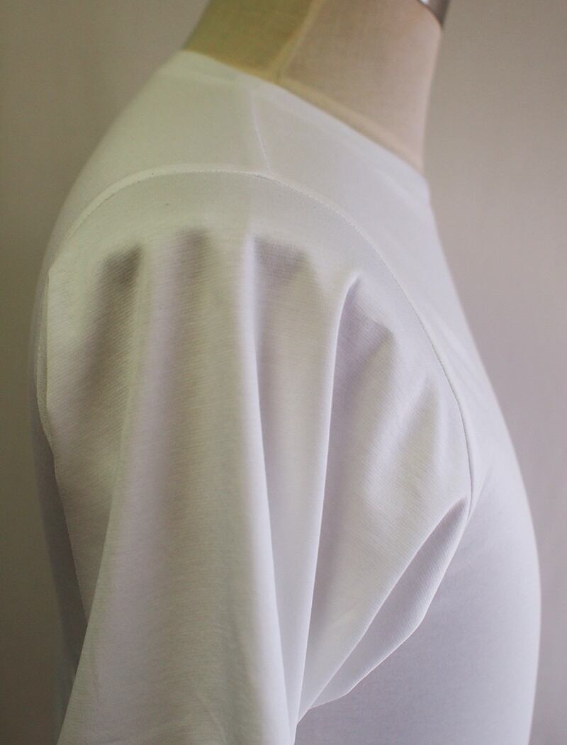 綿100%の60/-スーピマコットンを32Gのハイゲージで編み上げたポンチを使用、しっかりとしたハリある質感、型崩れしにくいジャージー素材