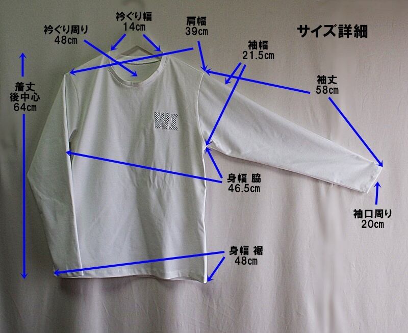 肩幅39㎝、袖丈58㎝のロングスリーブ、着丈64cm、身幅は脇で46.5㎝、裾48㎝、Sくらいのサイズ感