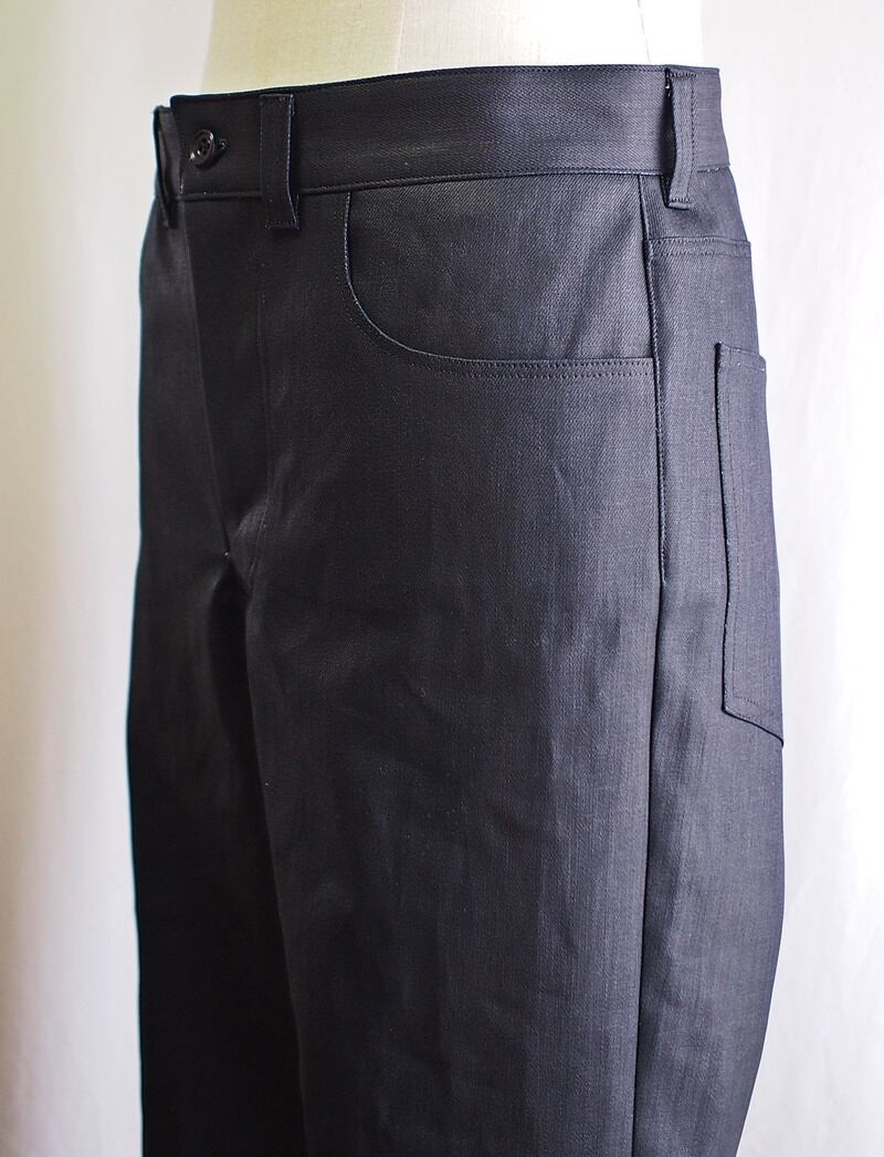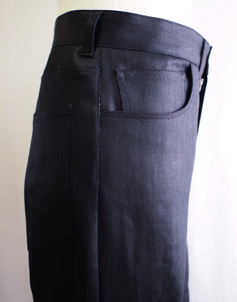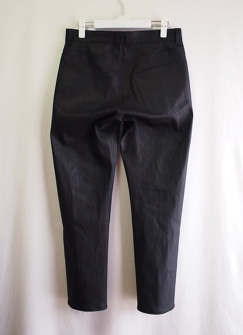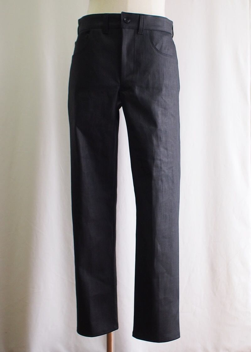 生地表面に黒い顔料を色付けしたストレッチデニムの5ポケットパンツ