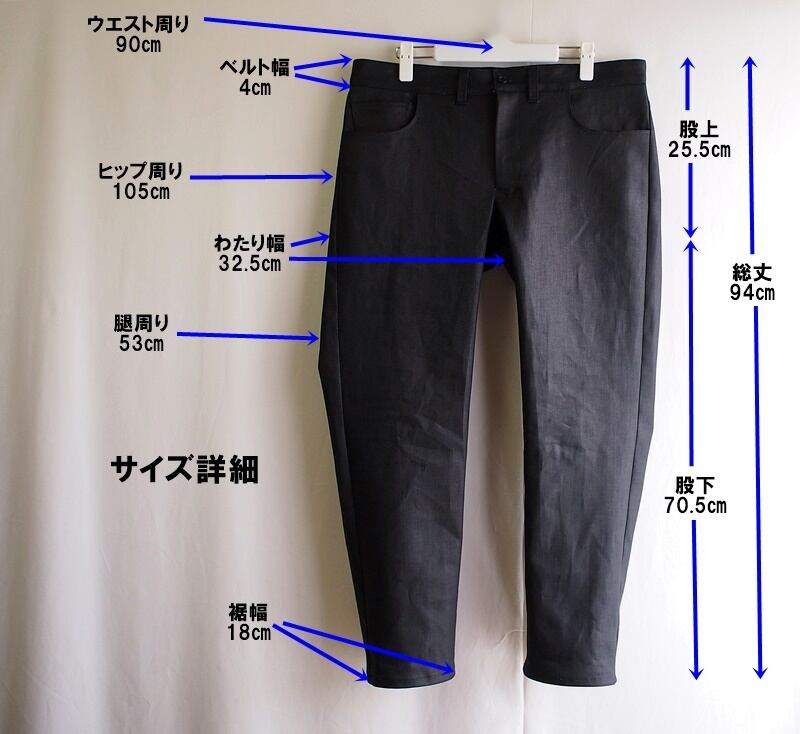 ウエスト90㎝、ヒップ105㎝、わたり幅32.5㎝、腿周り53㎝、裾幅18㎝、パンツ総丈94㎝、股上25.5㎝、股下70.5㎝
