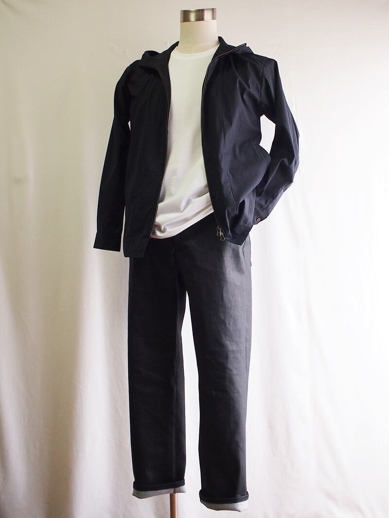 とてもハリ感があり、横方向にストレッチ性がある中厚程度のストレッチデニム、表面のブラック顔料は裏まで染み込まずに、裏面は一般的なデニムの表情、さらに通気性もあり、リジッドデニムほどのゴワゴワ感はありません