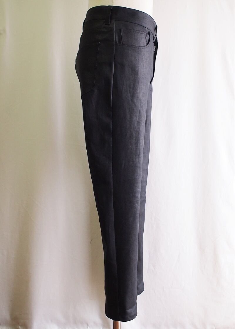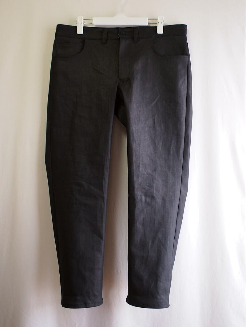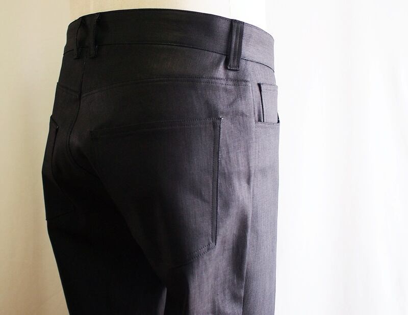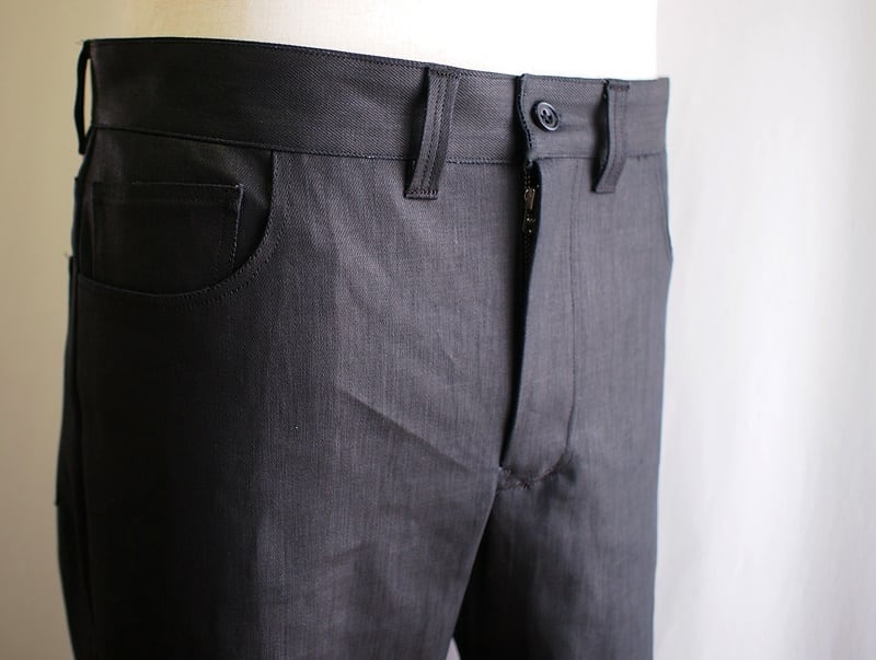 生地表面に黒い顔料を色付けしたストレッチデニムの5ポケットパンツ