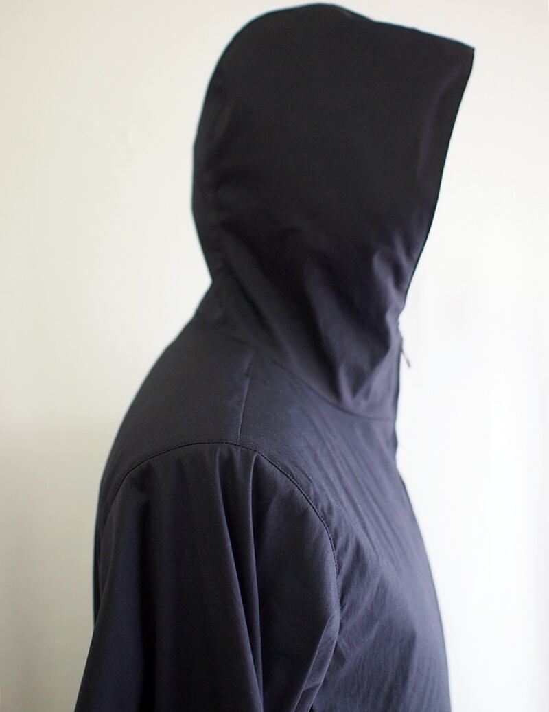 被った時に立体感あるフード、左右腰にはハンドウォーマータイプの1.5㎝幅片玉縁ポケット