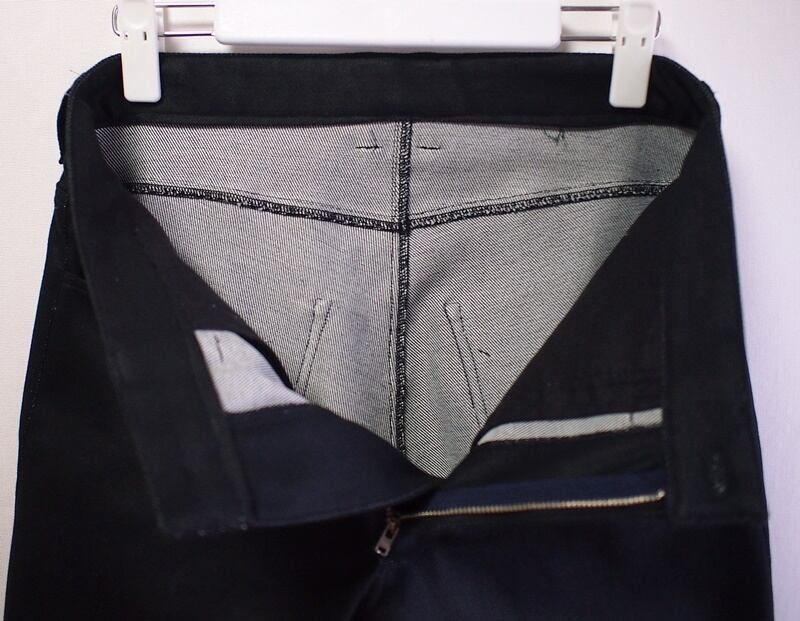後中心とバックヨークの接ぎ目は片倒しダブルステッチ、内側股下は片倒しコバステッチ、外側脇のシーム(接ぎ目)は端ロック片倒しで脇ポケット袋布までを押さえるコバステッチ