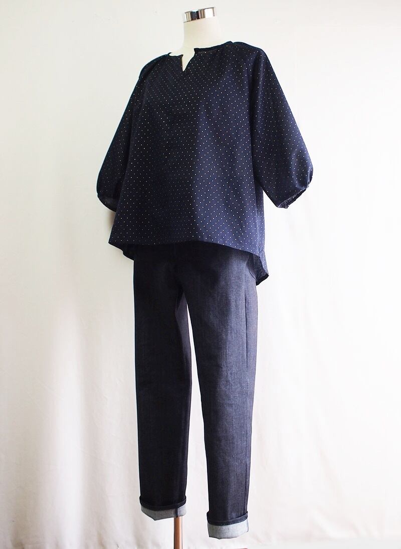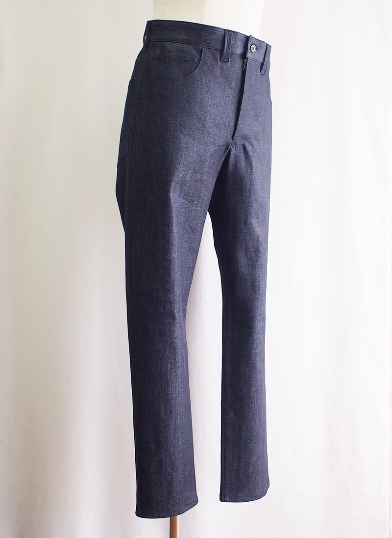 濃いインディゴブルーのストレッチデニムで5ポケットパンツ