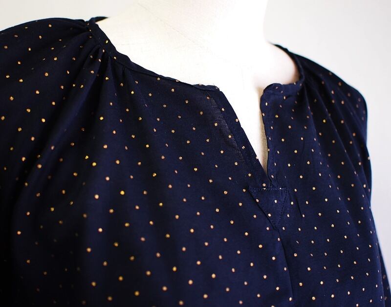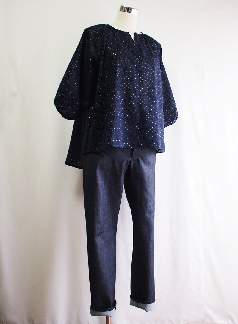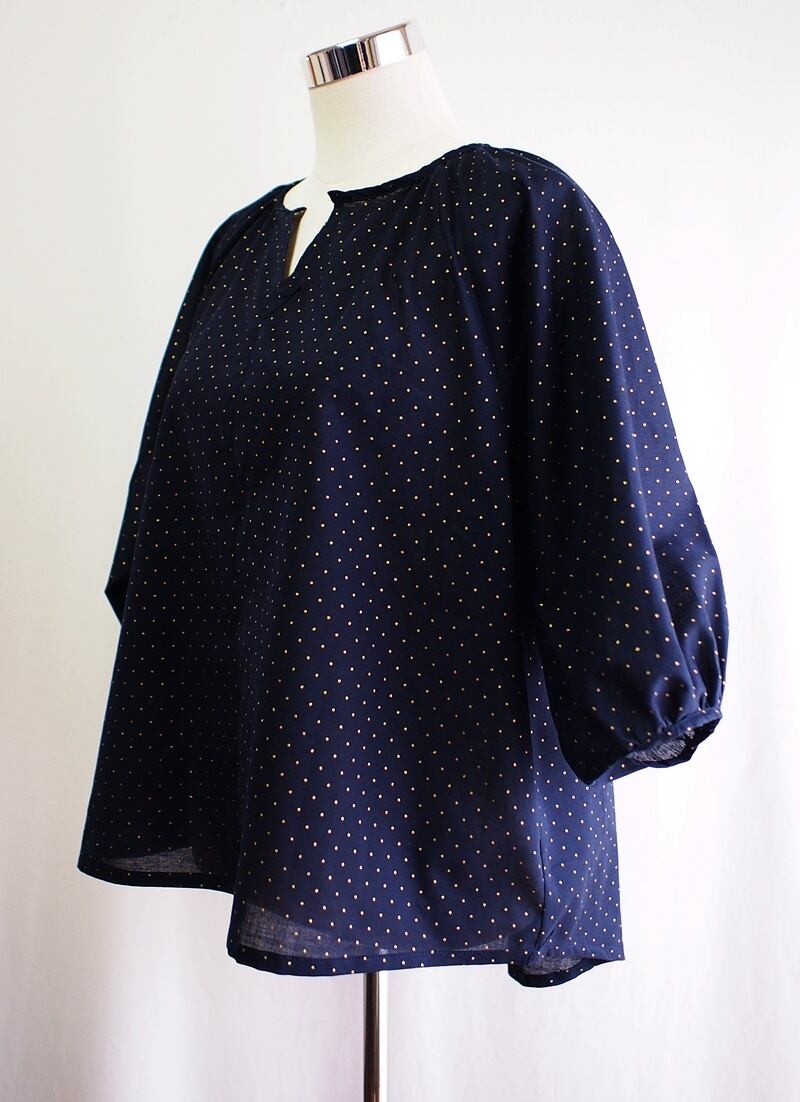 金色の水玉模様の生地でゆったりとしたスモックブラウス