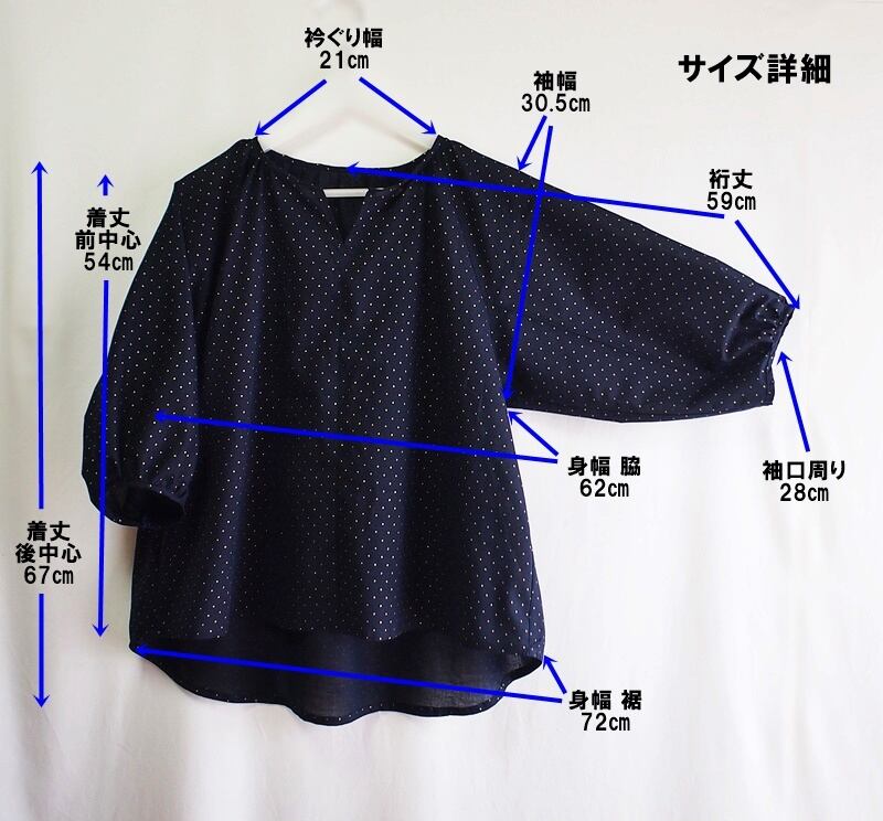裄丈(後衿ぐり中心から袖口端まで)59㎝のクオーターパフスリーブ、裾は前から後ろに長いラウンドカット、身幅は脇で62㎝、裾で72㎝、着丈は後中心で67㎝、前中心は54㎝