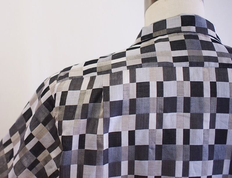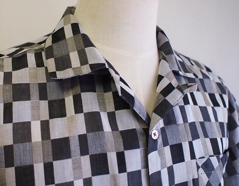 モザイクのようなブロックチェックが斬新な綿シフォンのオープンカラーシャツ
