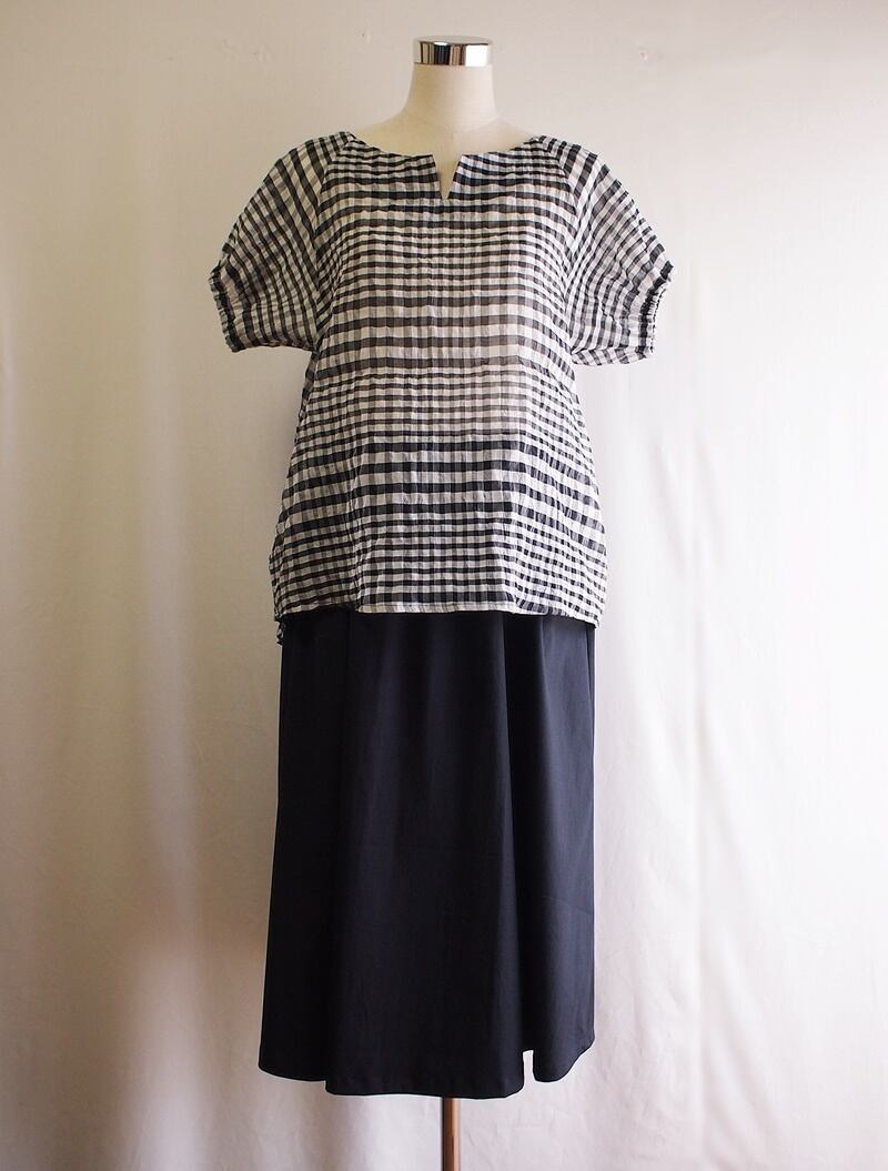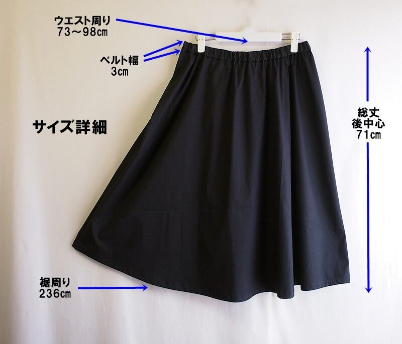 水洗いが可能でシーズン長く使える真っ黒なギャザーフレアーのイージースカートです。