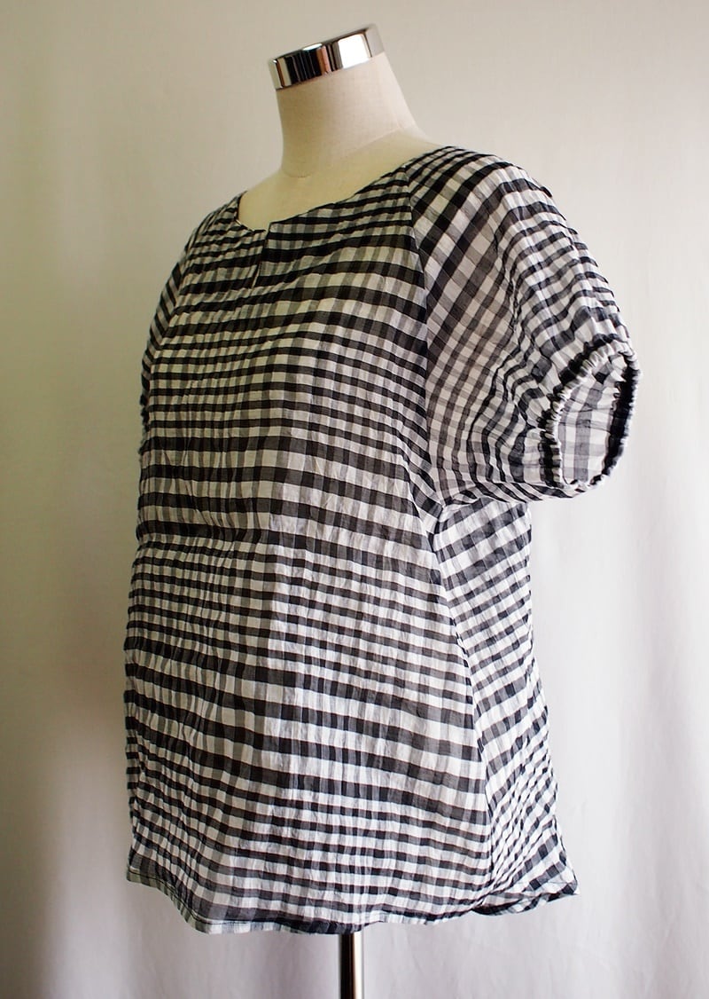 衿ぐり裏全体に見返しを付けて衿ぐり端へコバステッチ、袖口にゴムを入れたシャーリングのパフスリーブ、衿ぐりから斜めに切り替えたラグランのショートスリーブ、裾は前から後ろに長いラウンドカット