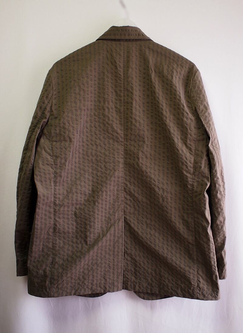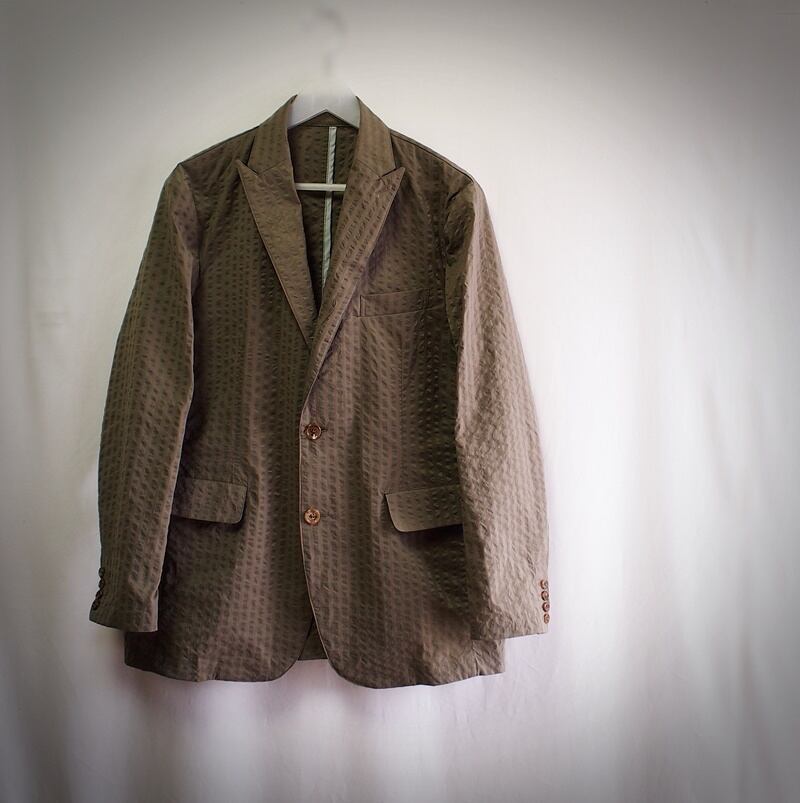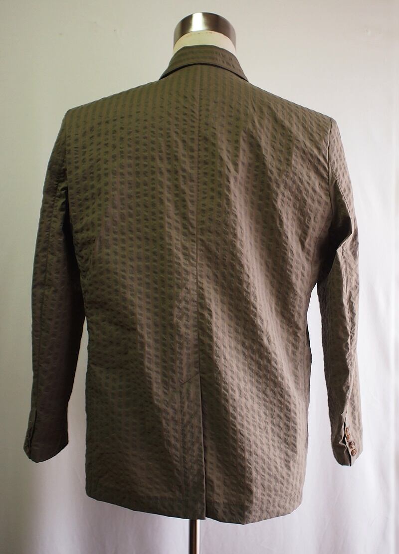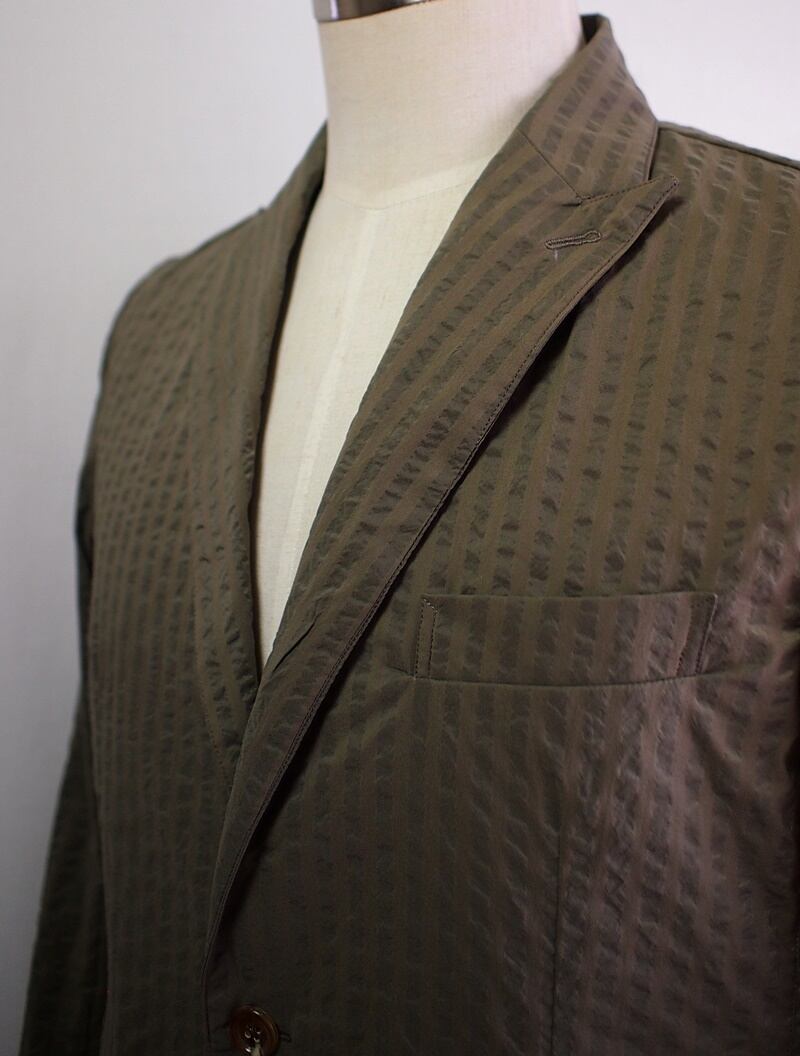 凹凸感ある縦畝が独特な表情のクールマックスストレッチサッカーの暑い夏に快適な着心地のピークドラペルでシングルテーラードジャケットです。