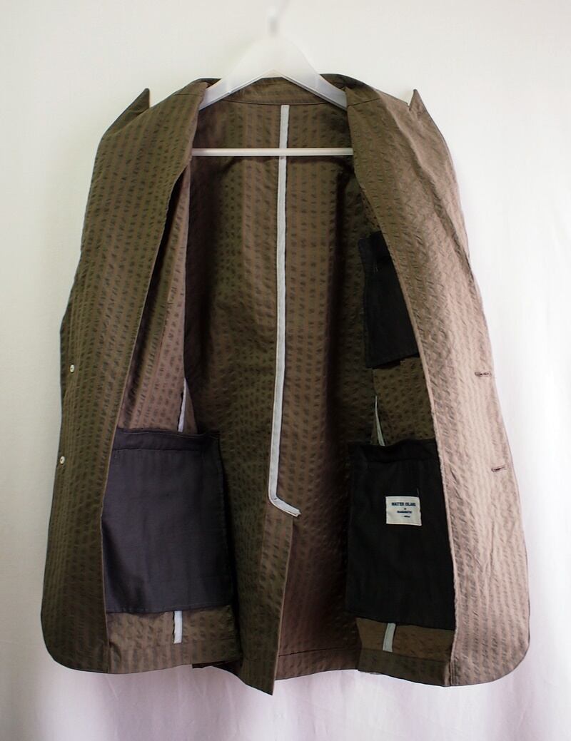後裾中心にはセンターベント、裾と袖口は三つ折りステッチ始末、裏側は前見返しだけの背抜き仕立て