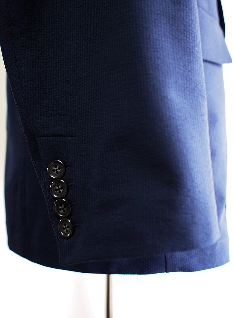 ネイビー系の2WAYストレッチシアサッカーを使用したピークドラペルのダブルブレストテーラードジャケット