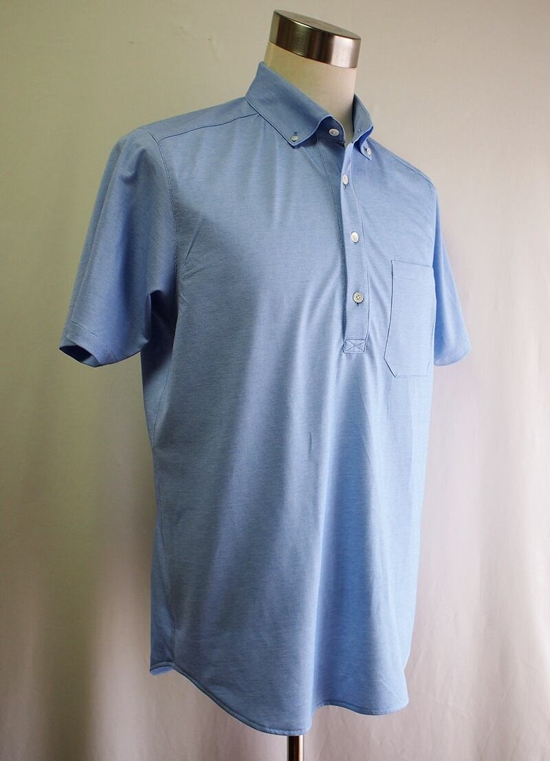 やや大き目なセミワイドカラーでボタンダウン、左胸にパッチポケット、前中心途中までの4つボタン開きプルオーバーシャツ