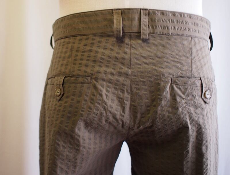 後側は腰上にフィットする2本のダーツ、ボタン留めのタブ付き片玉縁ポケット
