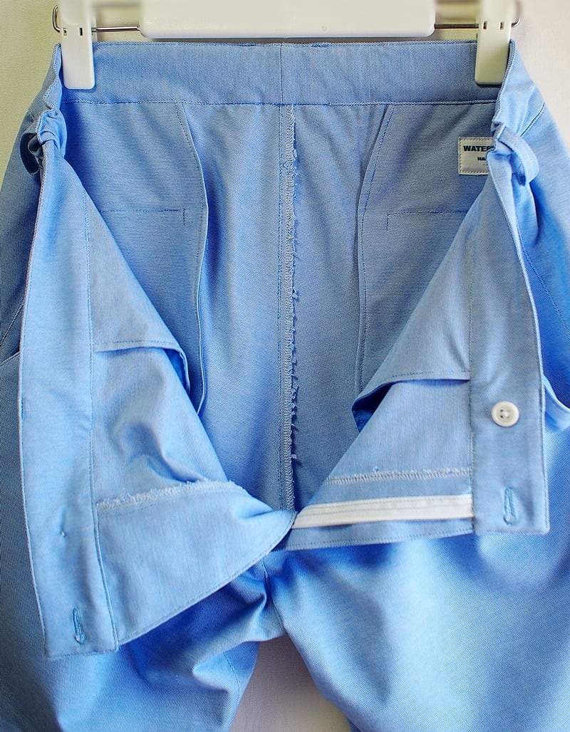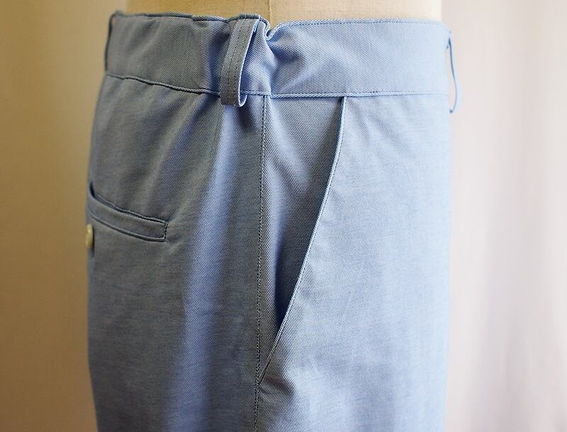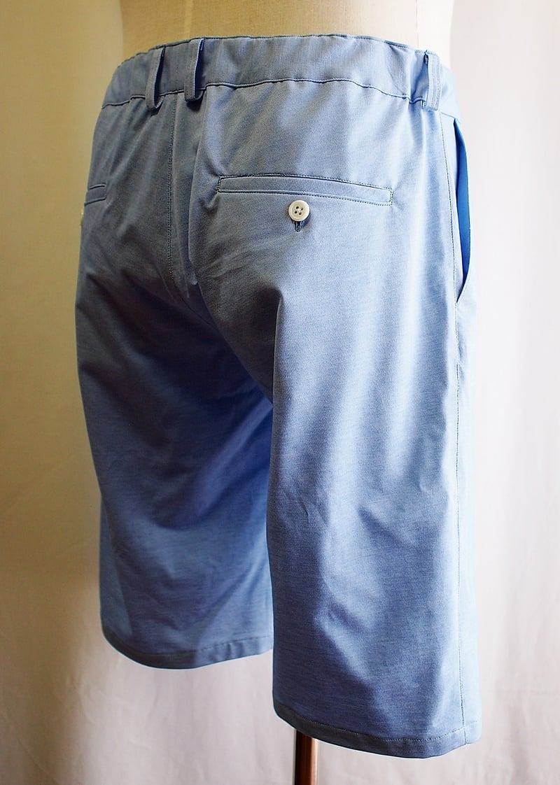 前側ノータックで両脇にスラントポケットのショートパンツ、後側にはボタン留めの片玉縁ポケット