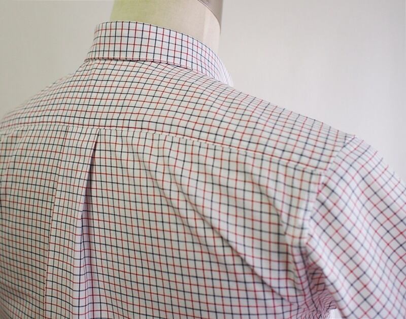 ナチュラルなショルダーラインで袖丈21.5㎝のショートスリーブ、メンズシャツらしい安定感ある肩ヨーク切り替え、身幅にゆとりを持たせるバックセンタープリーツ