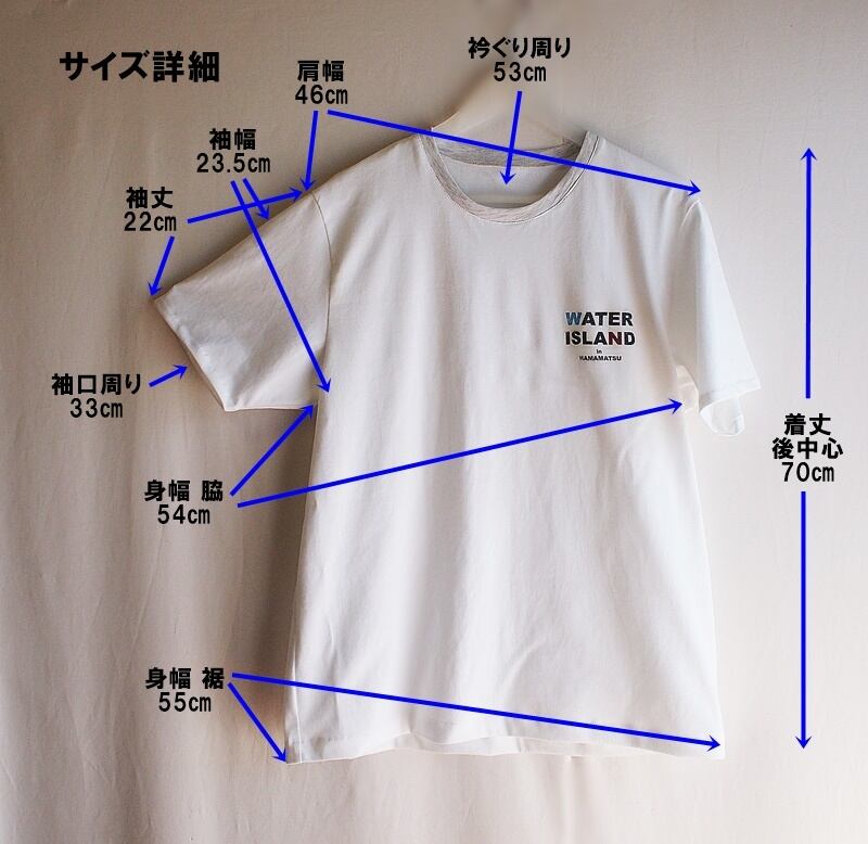 肩幅46㎝、袖丈22㎝のショートスリーブ、着丈70㎝、身幅は脇で54㎝、裾で55㎝、一般的なメンズで少し大き目なLくらいのサイズ感