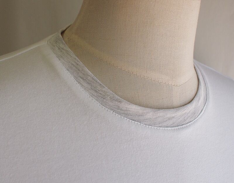 衿ぐりはバイカラーで1.5㎝幅のTopライトグレー天竺テープを接ぎ、裏側ロックして衿ぐり表側を押さえるコバステッチ