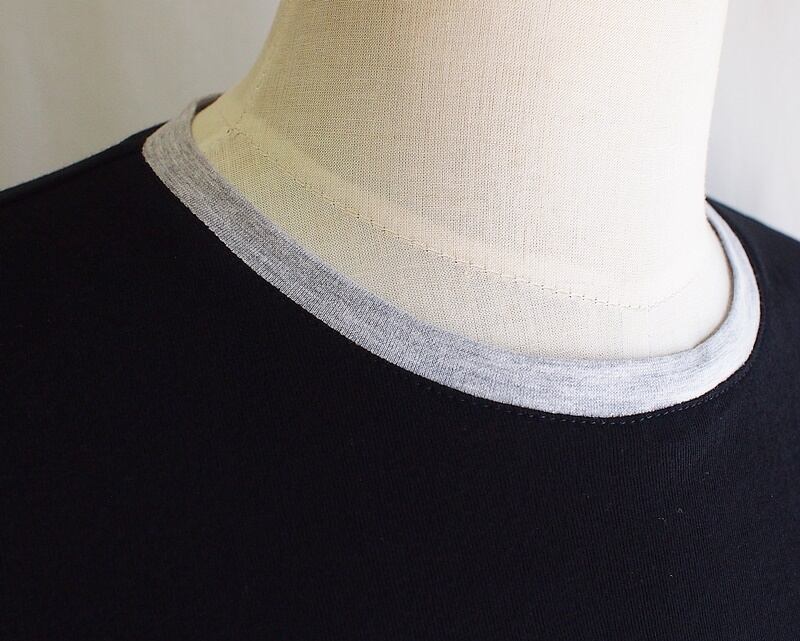 衿ぐりはバイカラーで1.5㎝幅のTopライトグレー天竺テープを接ぎ、裏側ロックして衿ぐり表側を押さえるコバステッチ
