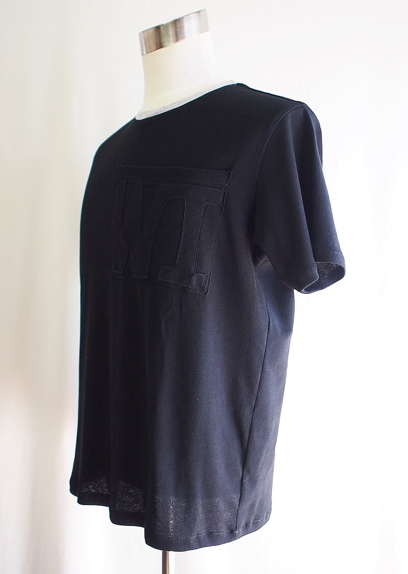 大きくWIロゴアップリケ付けた大きなパッチポケットが存在感ある黒いバイカラーネックのTシャツです。