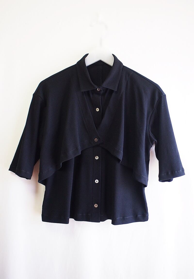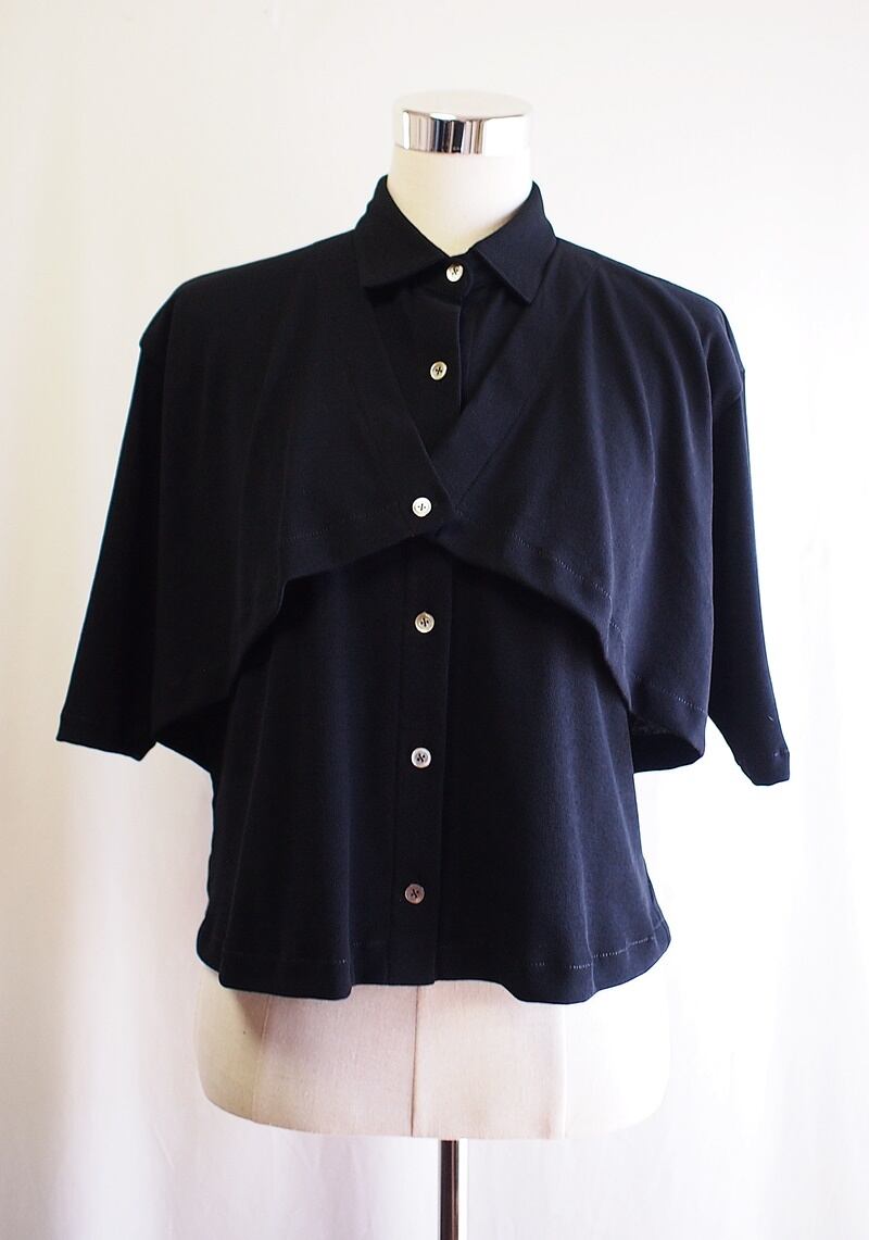 前身頃へボレロを羽織ったようなフレアー入ったレイヤードパーツ、前中心6つボタン開きで着丈短いオーバーブラウス
