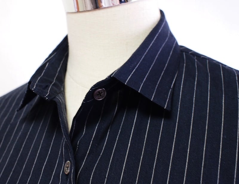 色合いはネイビーベースに白で12㎜間隔のペンシルストライプ、ハリコシ感がありサラサラした肌触りでカジュアルな表情の素材感