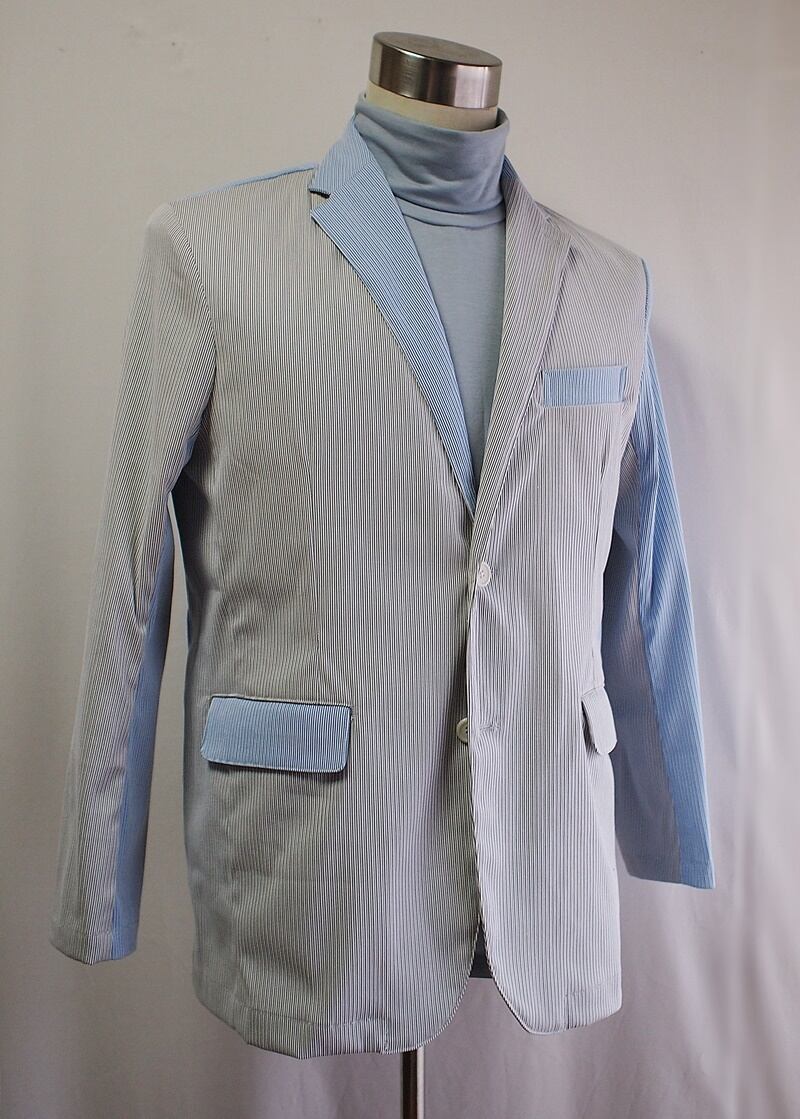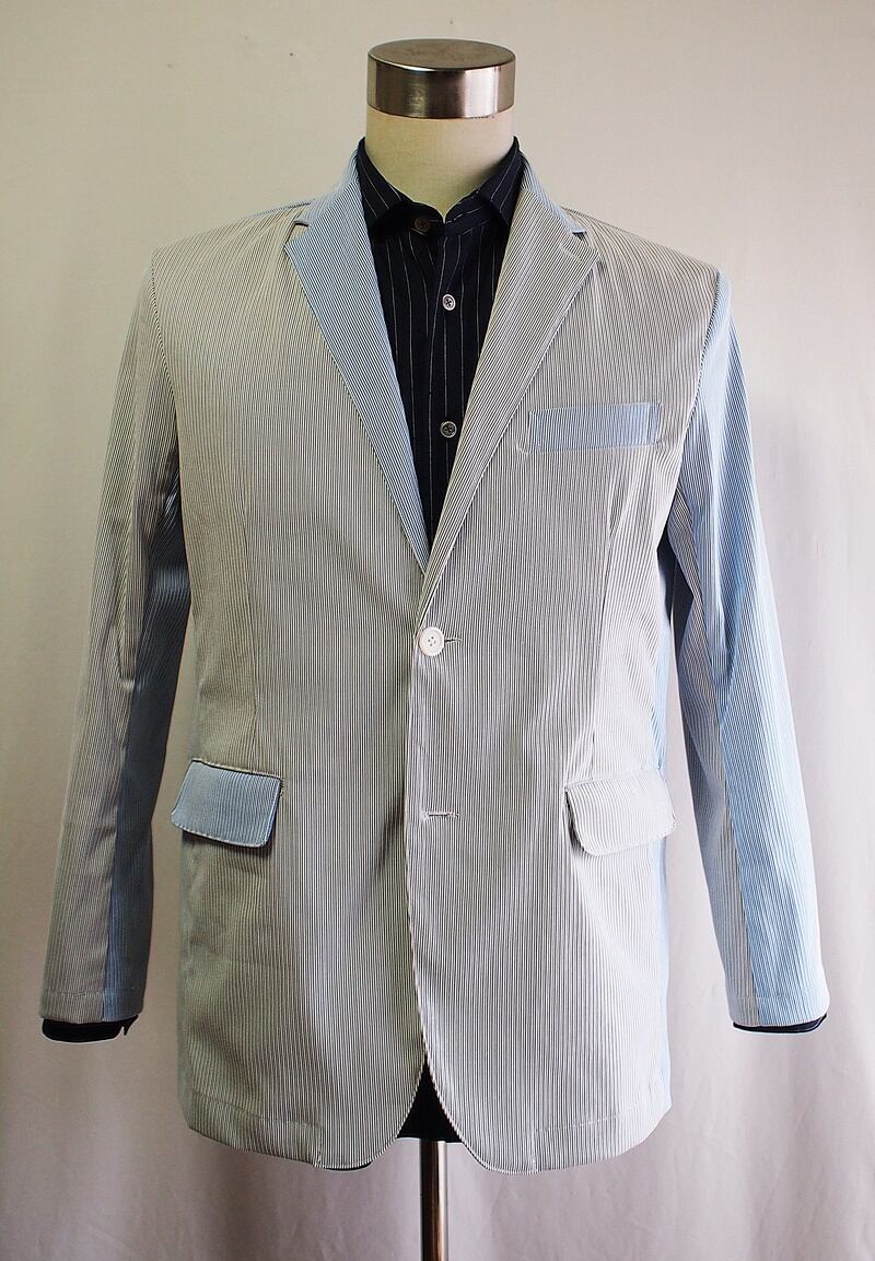 遠目には無地に見える細かなストライプ柄のコードレーンを2色、ライトグレー系とサックスブルー系を使用したクレイジーパターンのジャケット