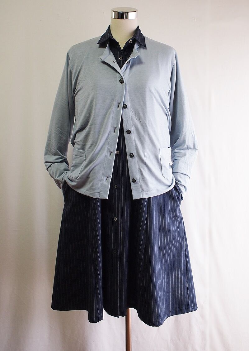 使用したのは、綿94%・ポリウレタン6%の40ベア天竺、色合いはライトスモークブルー、グレイッシュなサックスブルーというイメージ