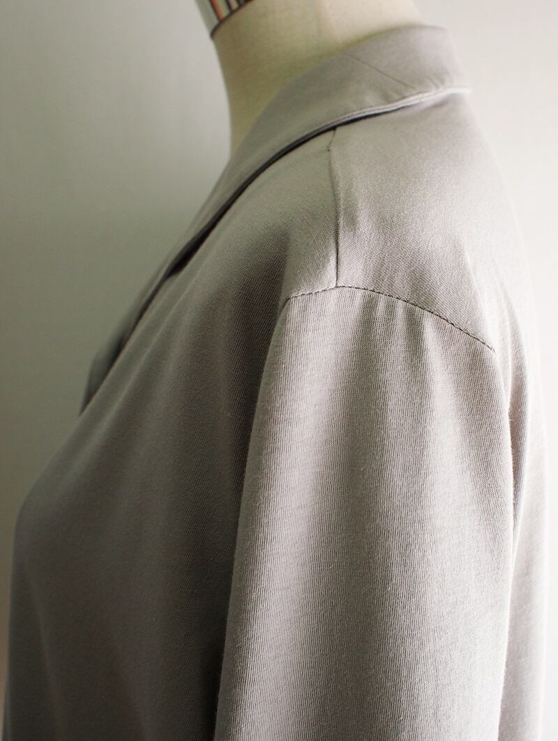 綿100%で緻密に編まれた30天竺をメインに使用、色合いは明るめなグレージュで光沢のない素材感、柔らかな風合いでボリューム感がありしっかりとしたジャージー