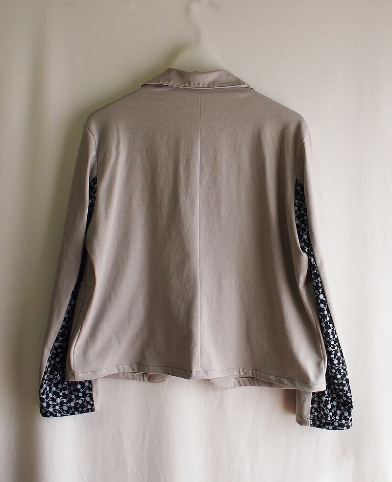 たった一つの…レディス★綿30天竺×Wガーゼ天竺★ミニショールカラー ★ジャケット★グレージュ&ネイビー系小花プリント★フリーサイズ
