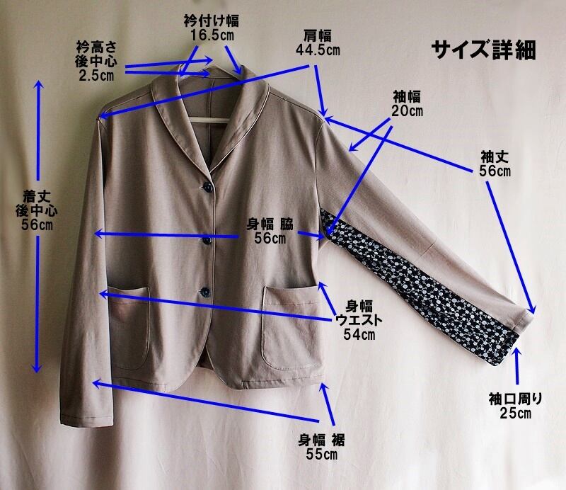 着丈は後中心で56㎝、肩幅44.5㎝、袖丈56㎝、身幅が脇で56㎝、ウエストで54㎝、裾で55㎝