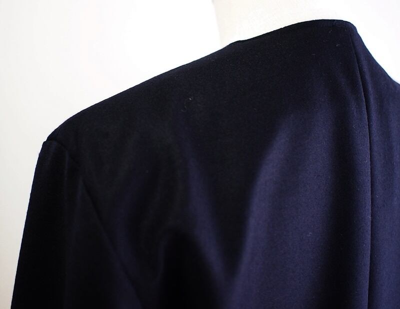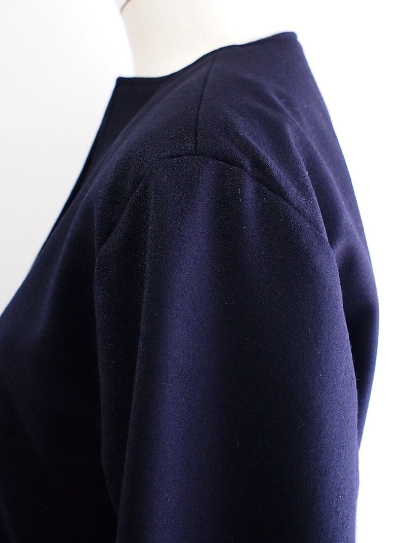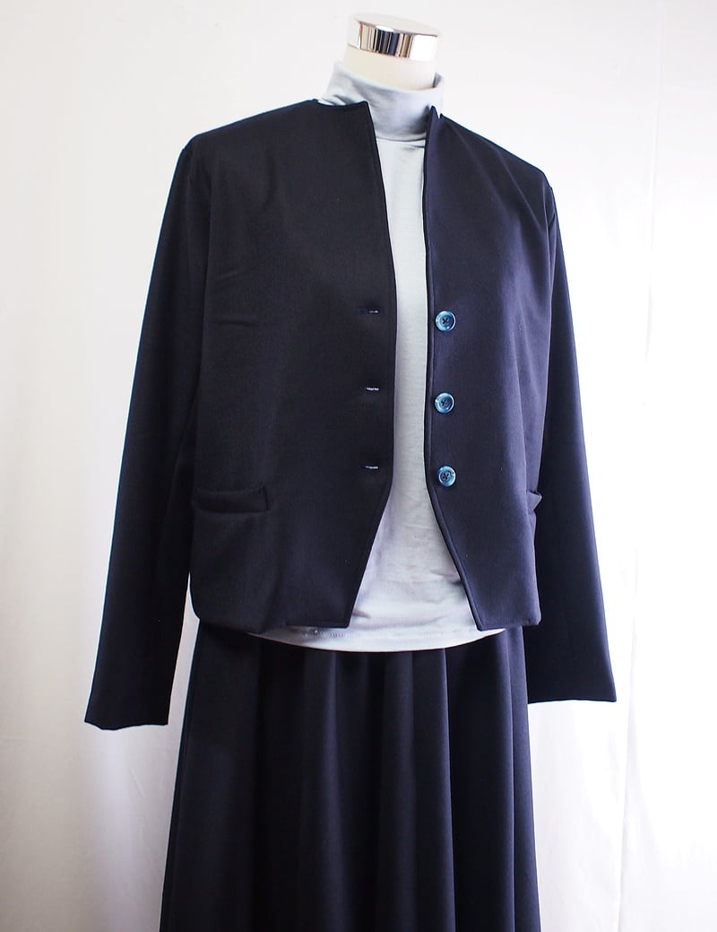 ダークネイビーのストレッチサキソニーで衿の無いジャケット