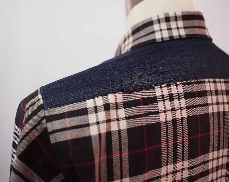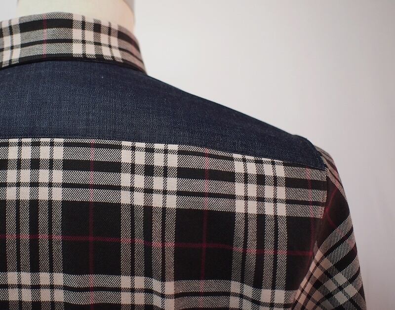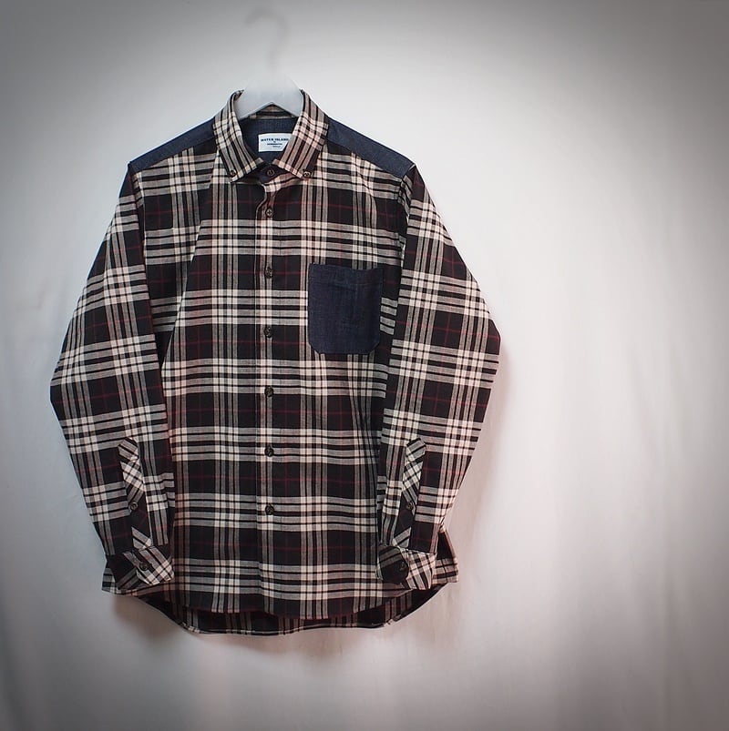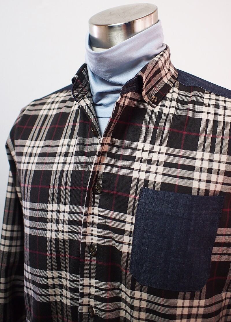 少し厚手のチェック生地、部分的にデニムを使ったボタンダウンシャツ