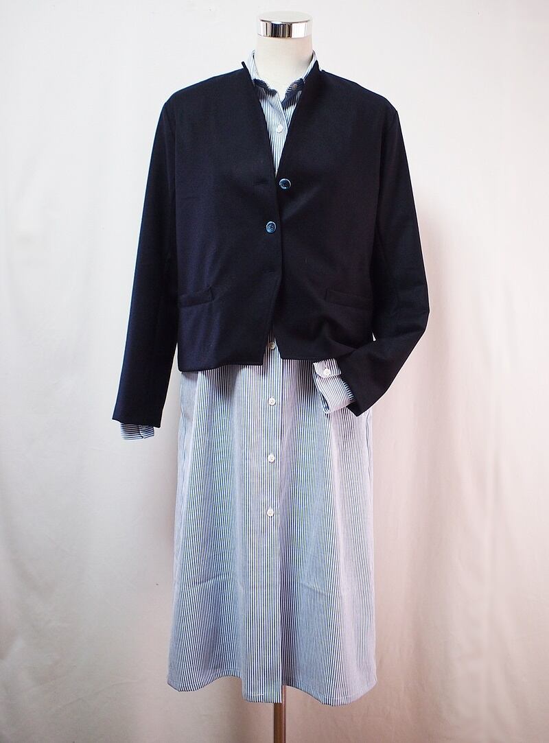 後中心で高さ3.5㎝の小ぶりなシャツカラー、前中心9つボタン開きのシャツカラーワンピース、ボタンは全て白の高瀬貝(直径11.5㎜)を使用