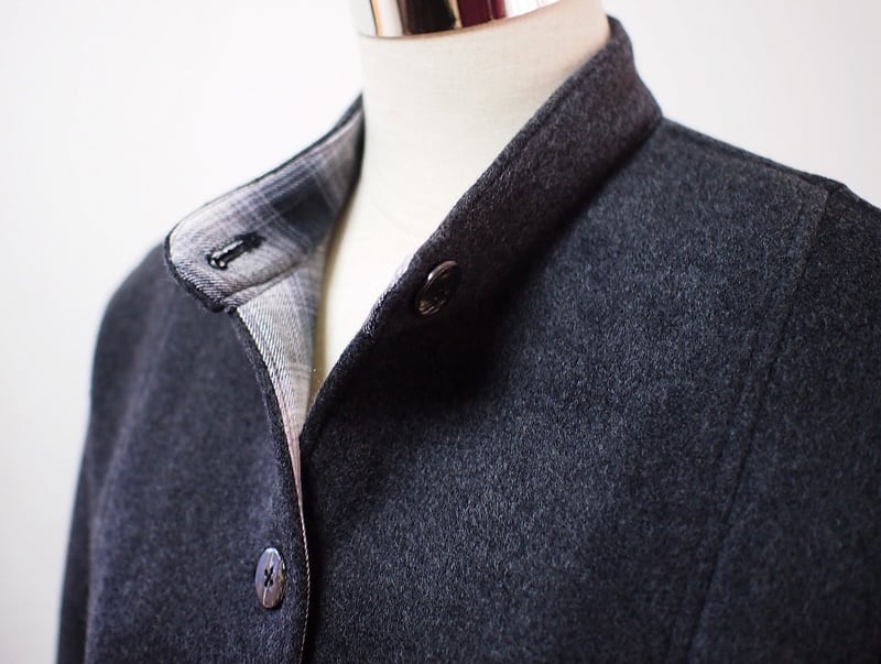 肩から裾へ縦のシーム(接ぎ目)で切り替えライン、前中心5つボタン開きのスタンドカラーコート