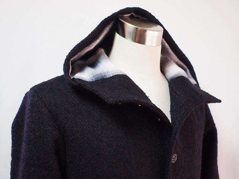 温かみあるウールループツイードとチェックの裏地でフーデッドハーフコート