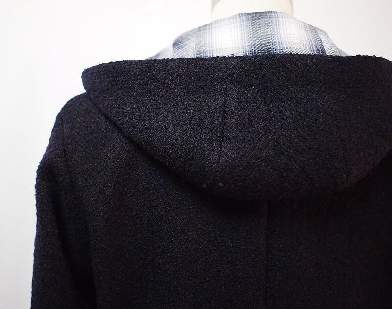 ネイビー&ブラウンミックスのループツイードと綿チェックライナーであたたかな着心地のフーデッドハーフコートです。