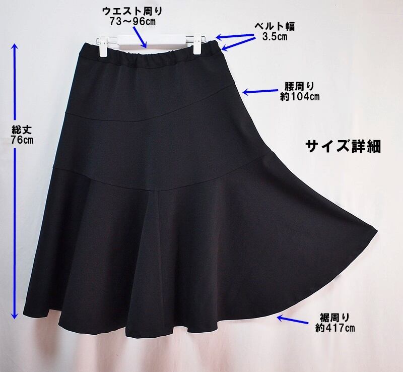 ウエスト周りは73㎝~96㎝まで対応、総丈76㎝、裾周りは417㎝のロングスカート
